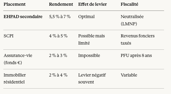 Pour apprécier l'intérêt de l'effet de levier sur l'EHPAD, comparons-le aux alternatives courantes :